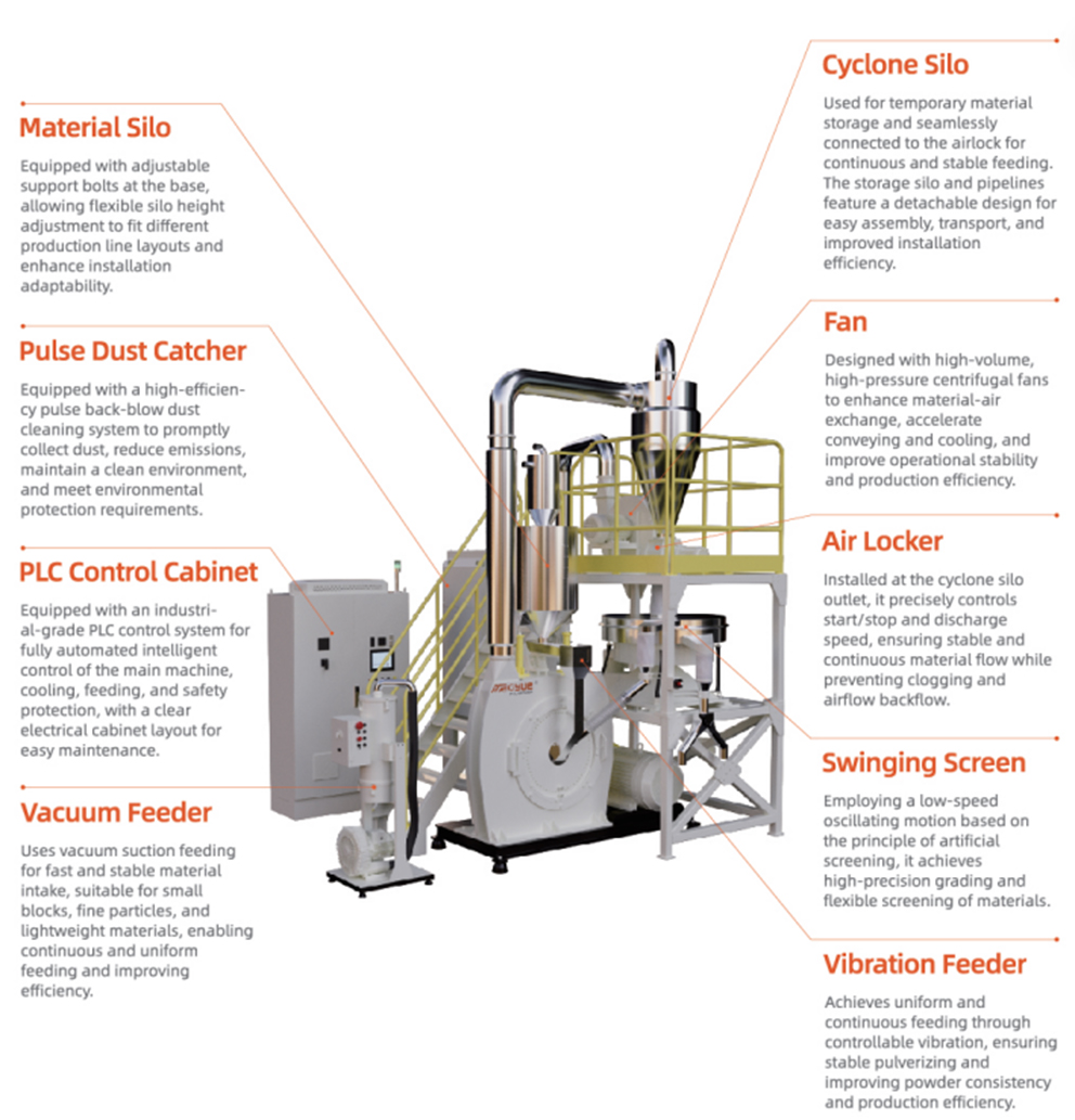 تبلغ فترة العائد على الاستثمار النموذجية 6–12 شهرًا فقط، مدفوعة بالتوفير الشديد في الكهرباء (أقل كيلووات ساعة لكل طن من المسحوق)، والحد الأدنى من تغييرات الشفرات، وأدنى معدلات الرفض، والنمو الهائل في الأرباح من مضاعفة القدرة. تشمل سيناريوهات التطبيق النموذجية إنتاج كميات كبيرة من الخلطات الرئيسية (خلطات رئيسية عالية التركيز تعتمد على البولي إيثيلين/البولي بروبيلين/الألومنيوم/البولي كربونات/البولي بروبيلين)، وتصنيع الخلطات الرئيسية الوظيفية/البلاستيك المعدل على نطاق واسع للغاية (خلطات رئيسية مقاومة للهب، ومضادة للكهرباء الساكنة، ومعززة، وموصلة، ومضادة للبكتيريا)، وطحن المواد المركبة عالية الحشو/عالية الإضافة (مما يتطلب دقة فائقة، وقابلية للتشتت، واستقرارًا). إعادة تدوير وإعادة تحبيب النفايات الرئيسية/الخردة الصناعية على نطاق واسع، وإمدادات عالية الإنتاج للغاية من مسحوق القولبة الدورانية، ومسحوق الطبقة الأساسية لأرضيات SPC، ومسحوق اللاصق بالذوبان الساخن، والمزيد.