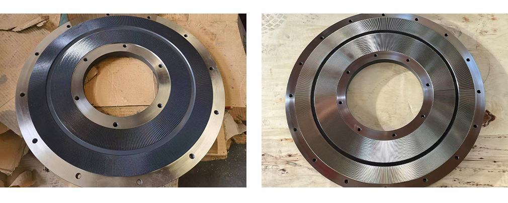 يتميز قرص الطحن بتصميم كبير على شكل حلقة مزدوج الطبقة متحد المركز. يتم تغطية كل من الحلقات الخارجية والداخلية بكثافة بأسنان دقيقة شعاعية دقيقة (مرتبة في صفوف مزدوجة مع مقاطع أسنان محسنة بزوايا متداخلة أو متكاملة). منطقة التغذية المركزية واسعة، في حين يتم تأمين الحواف بواسطة حواف فولاذية عالية القوة (تتميز بعشرات فتحات البراغي الدقيقة). يخضع الهيكل بأكمله لعملية تصنيع عالية الدقة باستخدام الحاسب الآلي ومعالجة حرارية بالكربنة، مما يؤدي إلى الحصول على لمسة نهائية عاكسة باللون الرمادي الداكن/الفضي الأسود.