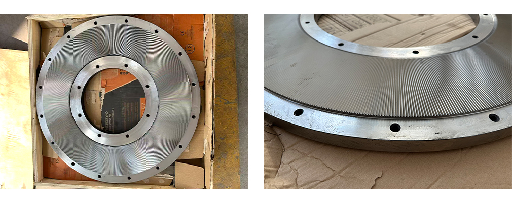 يستخدم قرص الطحن هذا عملية صب متجانسة جديدة + عملية تصنيع CNC دقيقة، وتتميز بشكل قرص دائري كبير مع منطقة تغذية مركزية، وأسنان قرص دوارة داخلية، وفتحات تثبيت قرص ثابتة خارجية (عشرات فتحات البراغي الدقيقة). تم تصنيعه بالكامل من سبائك الفولاذ عالية القوة، ويخضع للكربنة والتبريد + معالجة حرارية خاصة، مما يؤدي إلى تشطيب مرآة رمادي/فضي أسود غامق. تمنع حوافها المستديرة القطع، مما يعرض جماليات صناعية متميزة وجودة متينة. وباعتباره مكونًا أصليًا تم تطويره في المصنع بواسطة شركة Maoyue، فإنه يلغي الاعتماد على الواردات، ويحقق سيطرة محلية بنسبة 100% على المكونات الأساسية.